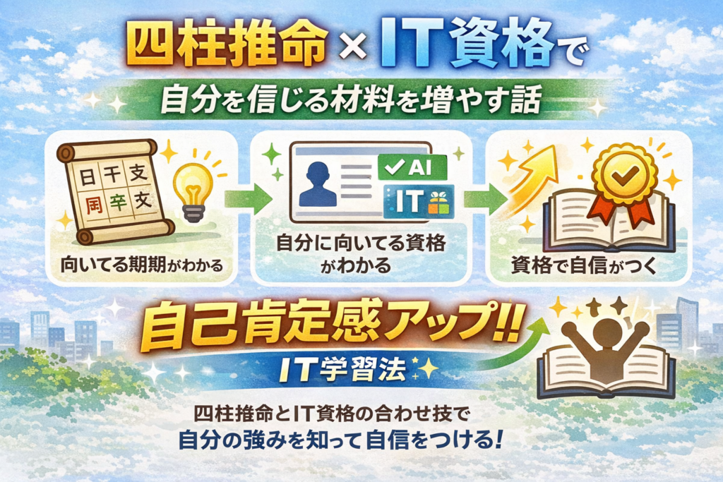 四柱推命で“自分の波”と“向いてる方向”を見立てて、IT資格で成果を積む。すると「自分はやれる」の根拠が増えて、自己肯定感もキャリアも一緒に底上げできます。